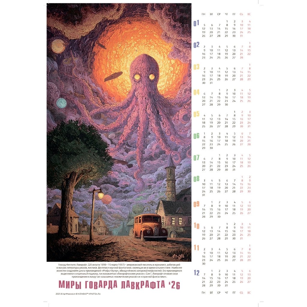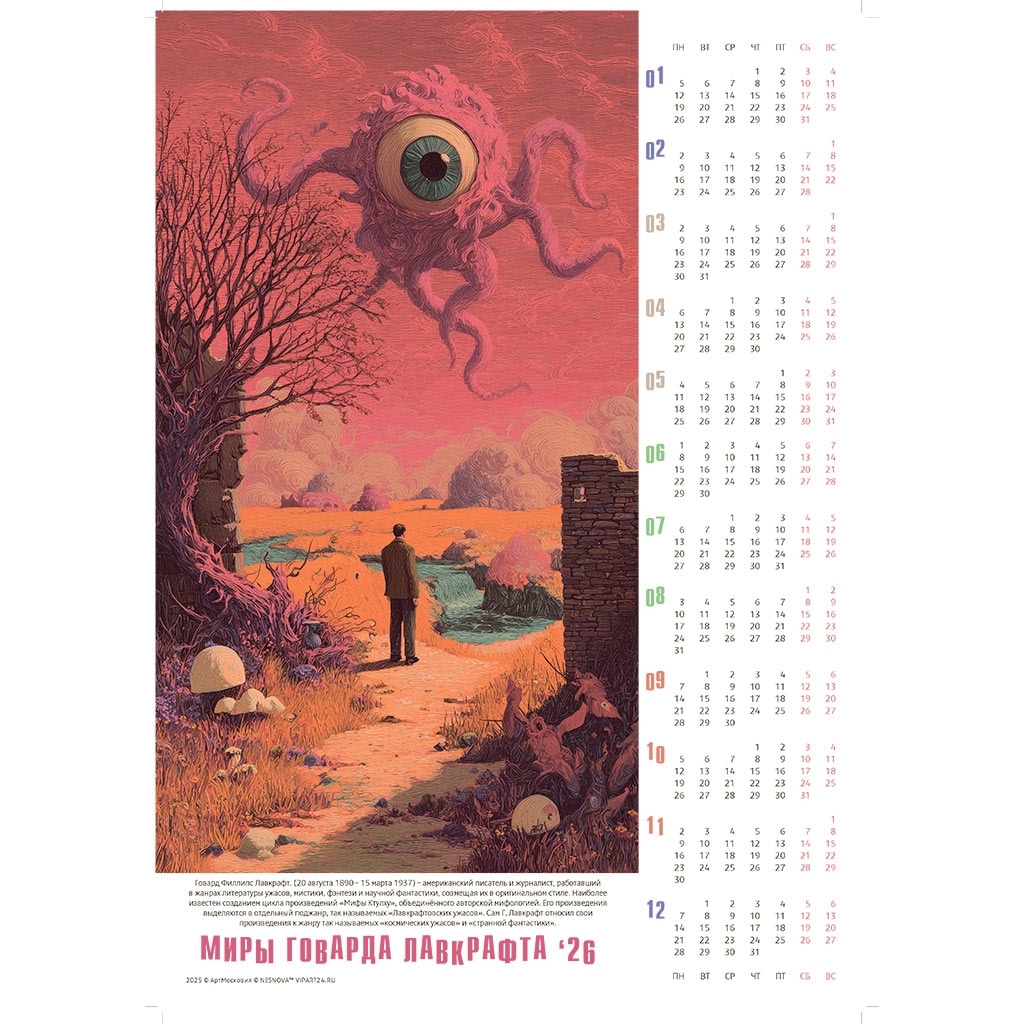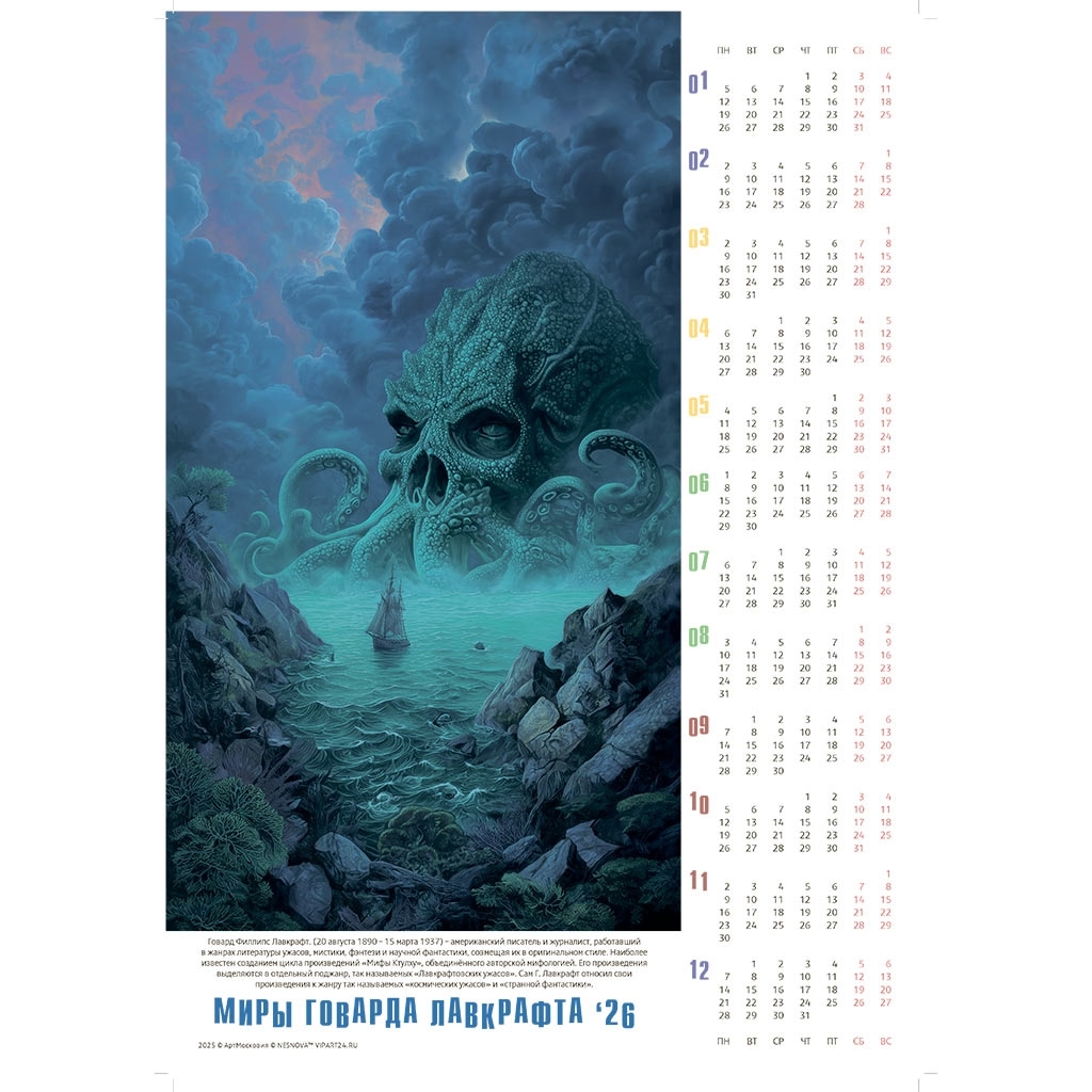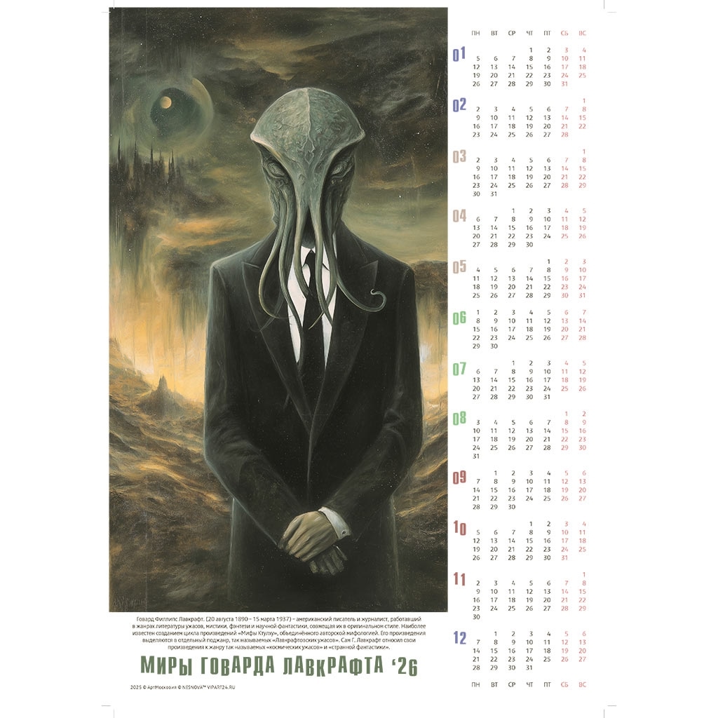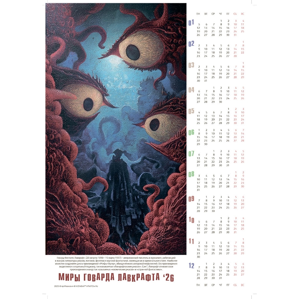 Серия календарей-постеров на 2026 год по мотивам произведений Лавкрафта завершена. В серию вошло 74 календаря. Все календари представлены по ссылке.